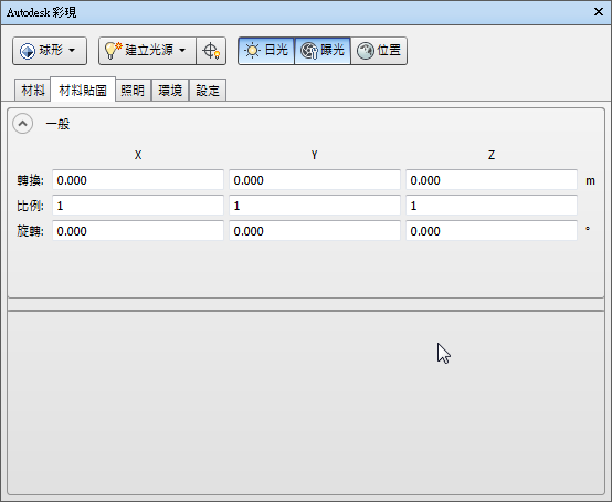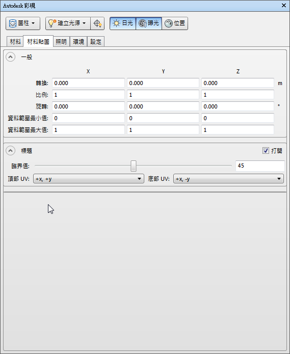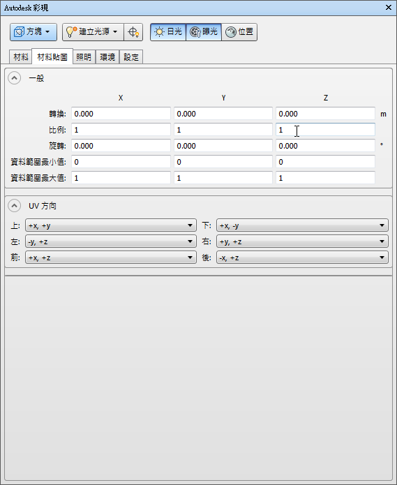 材料貼圖定義如何將 3D 座標和法線轉換為 2D 材質座標 (UV),從而用於從材質貼圖中查找顏色等。每個特定貼圖都是不同的「製作範本」,用於指示如何執行貼圖。對於「轉換」、「比例」和「旋轉」欄位的「一般」區段,先定義套用至每個 3D 座標和法線的轉換,然後再為每個特定的貼圖類型套用製作範本 (用於將 3D 點轉換為材質座標)。「網域最小值」和「網域最大值」欄位中的值被用在許多貼圖製作範本中,以確定針對每個座標將座標空間 (X、Y、Z) 中的哪個範圍 (最小值到最大值) 對映至材質空間中 0 到 1 的範圍。