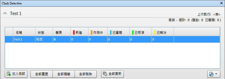 註: 目前選取的衝突測試摘要會永遠顯示在「Clash Detective」視窗的頂部。其中會顯示測試中衝突總數以及未解決的 (新建、作用中,已審閱) 和已解決的 (已核准、已解析) 衝突的詳細資料。如果設置衝突測試後在某些方面進行了改變 (可能包括變更選項,或已載入最新修訂版的模型),這意味著結果可能無法反映最新的模型或設定,則將顯示警告