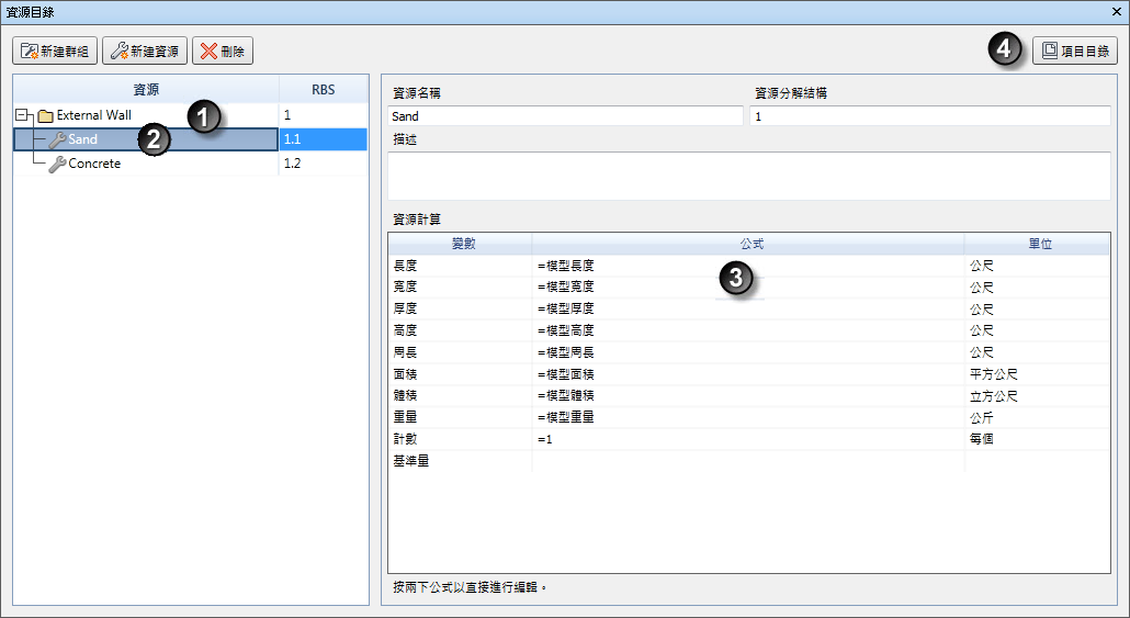 資源目錄是專案的資源資料庫。資源可依功能和類型 (例如材料、設備或工具) 進行關聯,並且可能包括牆板、牆面或結構元件。