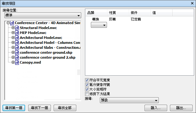 每個品類和性質名稱都有兩個部分 - 使用者字串 (在 Autodesk Navisworks 介面展示) 和內部字串 (不展示,主要由 API 使用)。依預設,以這兩部分來比對項目,但可以指示 Autodesk Navisworks 僅以其中一個部分來比對項目 (如有必要)。例如,可以在搜尋項中忽略使用者名稱,並且僅以內部名稱比對項目。這在規劃與可能正在執行 Autodesk Navisworks 本地化版本的其他使用者共用已儲存的搜索項時,將會很有用。