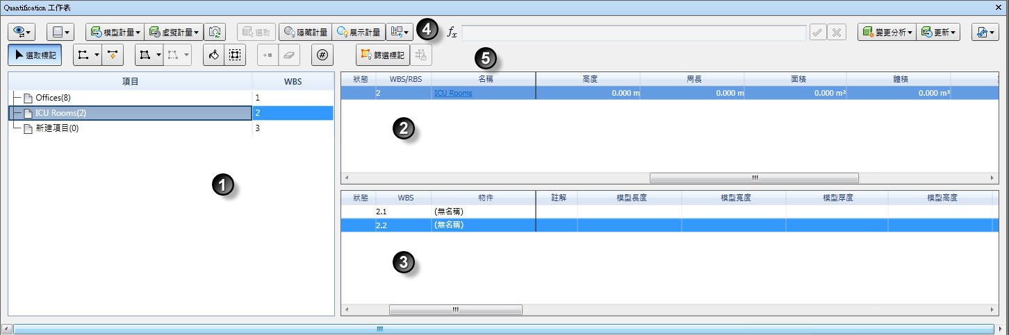「Quantification 工作簿」是主要工作區。您可以在此處執行模型 (自動) 計量或虛擬 (手動) 計量。透過按一下