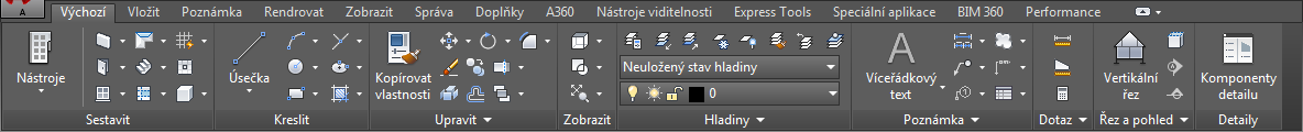 Karta Výchozí obsahuje příkazy, které jsou v rámci aplikace nejčastěji používány. Nacházejí se zde základní nástroje objektů, výkresů a také často používané pomůcky, jako například nástroje úprav, hladiny a základní poznámky. Karta Výchozí slouží v novém výkresu jako výchozí bod.