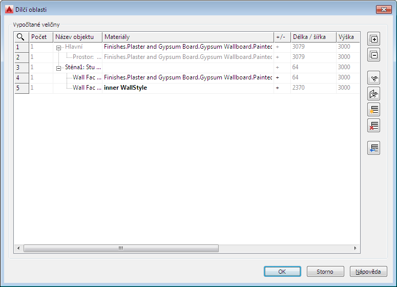Dialog Dílčí oblasti zobrazuje seznam všech podřízených oblastí, které jsou vypočteny pro hlavní objekt. Dílčí oblasti, například otvory (okna nebo dveře) ve stěnách, jsou systémem automaticky rozpoznány a vypočítány podle pravidel definovaných v nastavení výpočtu. Dílčí oblasti lze definovat ručně (jako součet nebo rozdíl oblastí).