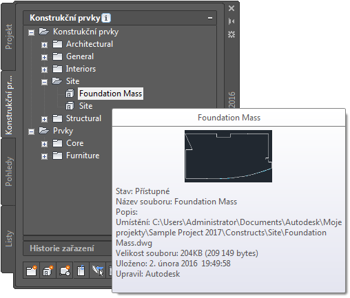 V Navigátoru projektu lze zobrazit zmenšené náhledy projektových výkresů. Náhled může obsahovat grafiku, detail nebo obojí. Zobrazení náhledů se může hodit při procházení rozsáhlého projektu s mnoha výkresy.