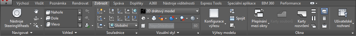 - Vzhled Na tomto místě lze vybrat předdefinované pohledy, vytvořit nové pohledy, otevřít Správce pohledů, vybrat vizuální styl, otevřít Správce vizuálních stylů a určit nastavení pro Procházení a průlet. Umožňuje přístup k předdefinovaným tématům zobrazení. Dále umožňuje úpravu rovin oříznutí a přístup k příkazům Regenerovat.