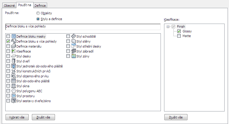 Ruční vlastnosti, které budou stejné pro všechny kopie stylu, náležejí do definice sady vlastností založené na stylu, která je použita na styl (například styl stěny) nebo definici (například definici vícepohledového bloku).