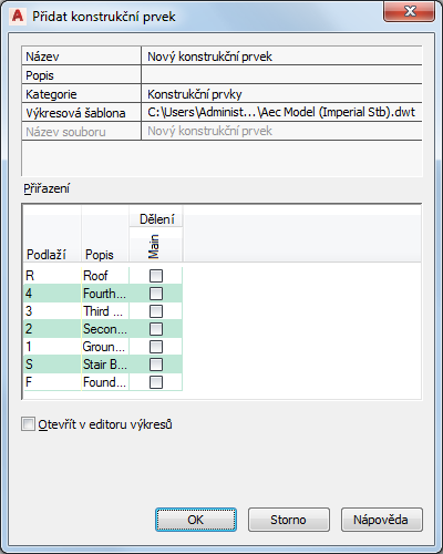 | přiřadit konstrukční prvek k hladině a dělení | v tabulce přiřazení vyberte správnou hladinu a dělení. Vyberte požadovaný řádek hladiny a sloupec dělení a zaškrtněte příslušné políčko. Poznámka: Měli byste zaškrtnout pouze jednu hladinu a dělení. Více hladin a dělení vytváří rozsahové konstrukční prvky.