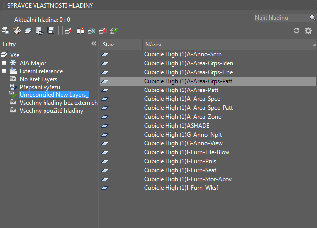 Když kliknete na odkaz, otevře se Správce vlastností hladiny a automaticky se vybere filtr Nesjednocené nové hladiny. Nové hladiny, které byly přidány do výkresu nebo do připojených externích referencí, jsou zobrazeny v seznamu.