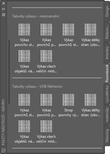 Paleta nástroje Roombook obsahuje různé tabulky výkazu podle toho, jaký je aktuální standard výpočtu. Příkazy jsou propojeny se souborem