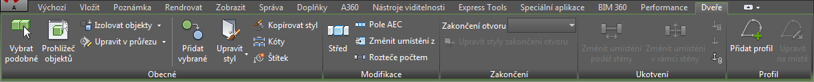 - Kontextové karty se zobrazují v závislosti na objektu, který je vybrán na kreslicí ploše. Jakmile vyberete dveře, zobrazí se kontextová karta pro dveře. Příkazy na kontextových kartách odpovídají příkazům v kontextové nabídce objektu.