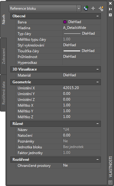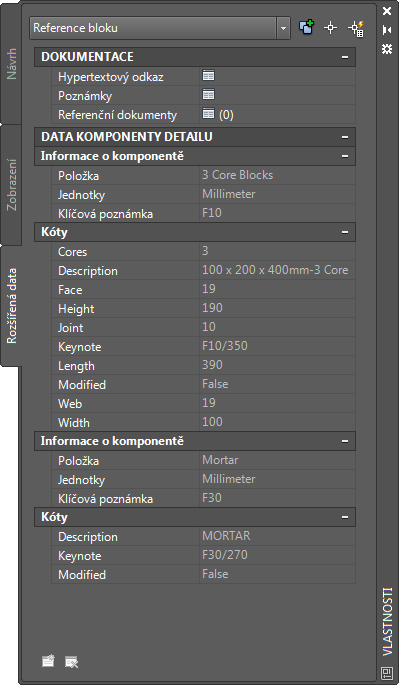 Následující obrázek ukazuje kartu Rozšířená data palety Vlastnosti pro blok detailu betonových tvárnic.