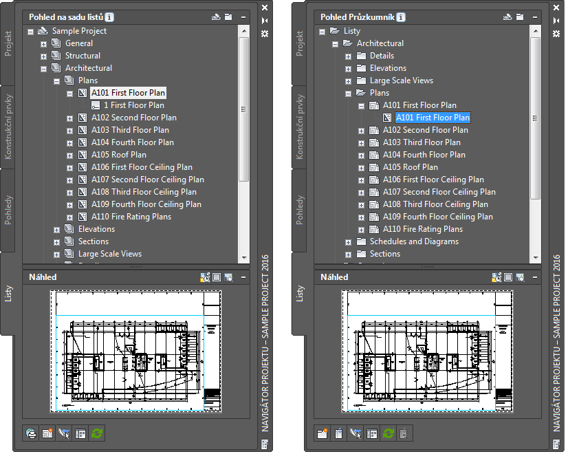 Karta List uvádějící Pohled sady listů projektu (vlevo) a Pohled průzkumníku (vpravo)