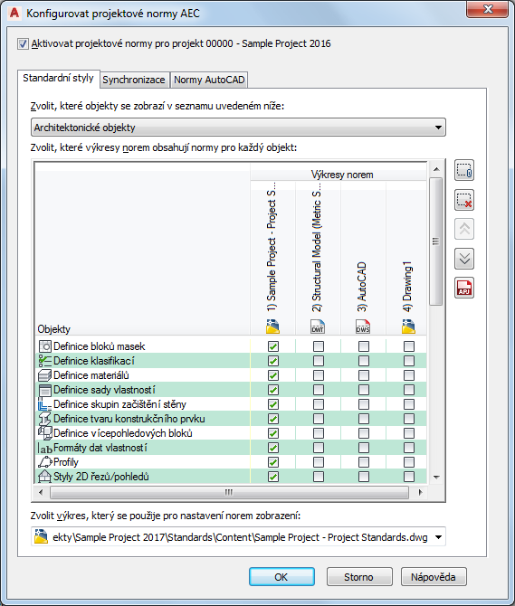 Pro nastavení stylů norem a nastavení zobrazení definujte jeden nebo více výkresů projektových norem, které obsahují normy pro styly a nastavení zobrazení. Tyto výkresy mohou být typu DWG, DWT nebo DWS a jsou přidány do dialogu konfigurace.