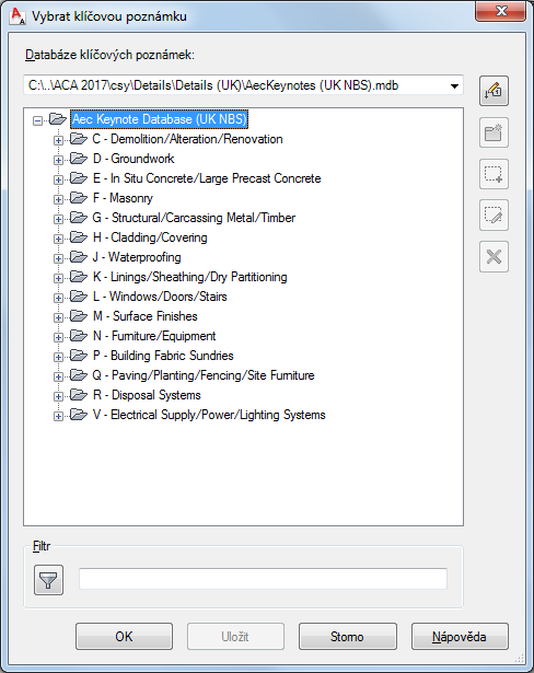 Dialog Vyberte klíčovou poznámku poskytuje hierarchicky stromové zobrazení databáze klíčové poznámky. Můžete vybrat klíčovou poznámku, kterou potom vložíte do výkresu nebo ji připojíte ke stylu objektu, definici materiálu nebo komponentě detailu. Dialog se zobrazí v případě, že se pokusíte přidat klíčovou poznámku k objektu, který klíčovou poznámku nemá. Také to můžete vybrat z dialogu Pole a z dialogů, které slouží ke specifikování klíčových poznámek pro architektonické objekty nebo jejich komponenty. Když generujete legendu klíčové poznámky, můžete zpřístupnit dialog Vyberte klíčovou poznámku během procesu vkládání tím, že kliknete na pravé tlačítko myši a kliknete na položku Z databáze nebo zadejte d (d jako databáze) na příkazový řádek.