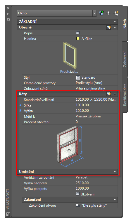 | šířku panelu rohového okna ukotveného ke stěně | zadejte hodnotu pro šířku 1 nebo pomocí nástroje Označit vyberte dva body, kterými určíte vzdálenost. |