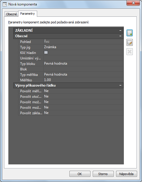 Tento postup slouží k úpravám vlastností jednotlivých komponent v rámci databáze komponent detailů. Vlastnosti na kartách Obecné a Parametry v dialogovém okně Vlastnosti komponenty představují základ pro jednu nebo více metod (recipe), které software používá ke kreslení komponent v různých pohledech. Každá metoda (recipe) určuje typ jig nebo postup při kreslení pro umístění komponenty ve specifickém pohledu. Metoda může obsahovat také informace týkající se hladiny a vzoru šrafování. Tento postup je také možné použít pro úpravy komponent ve výchozí britské a metrické databázi komponent detailů dodané se softwarem nebo k úpravám komponent v databázích, které vytvoříte.