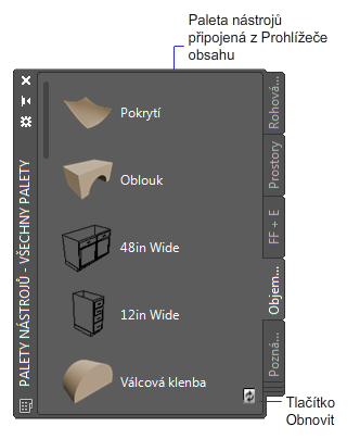 Když je paleta napojena na sadu palet nástrojů z katalogu v Prohlížeči obsahu, ve spodní části palety se zobrazí tlačítko Obnovit.