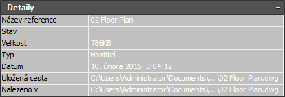 - Položka Nalezeno v zobrazí cestu, kde byla externí reference nalezena. Jestliže nebyla pro externí referenci uložena žádná cesta nebo pokud se externí reference již nenachází v zadané cestě, program vyhledá externí referenci a zde zobrazí její umístění.
