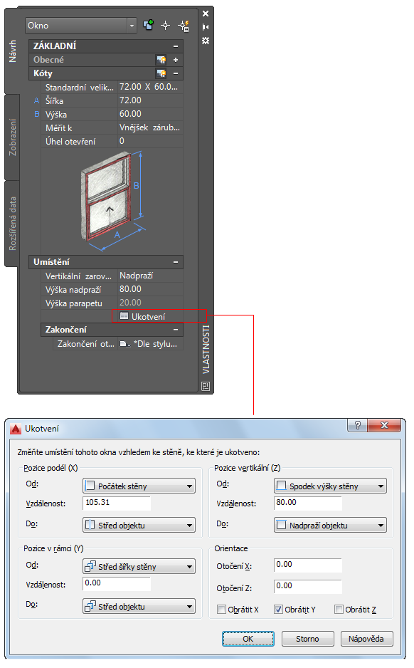 Vlastnosti objektu se zadávají a mění na paletě Vlastnosti. Většina vlastností se přímo zadává a okamžitě aktualizuje na obrazovce. Některé objekty mají složité vlastnosti, které se zadávají do tabulek prostřednictvím palety Vlastnosti.