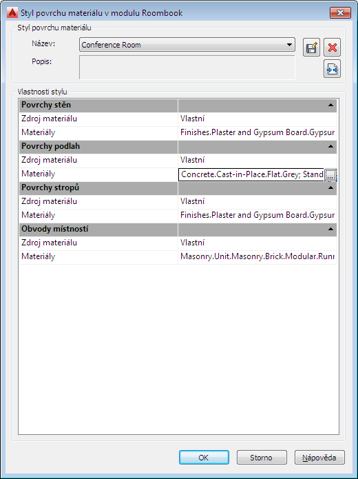 Modul Roombook obsahuje sadu předdefinovaných stylů materiálů povrchu, které lze načíst do výkresu. Styly materiálů povrchu lze upravit, uložit, kopírovat, odstranit, importovat nebo exportovat.