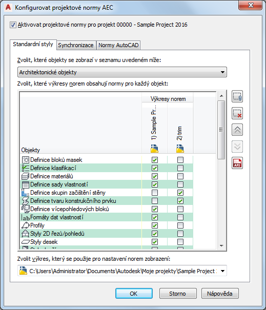 Když je projekt nebo projektový výkres synchronizován s jeho normami, jeho styly a nastavení zobrazení jsou porovnány s projektovými normami, aby byly nalezeny nesrovnalosti verzí mezi nimi a jejich následnou opravu.