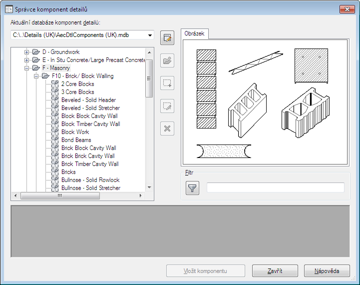 Dialog Správce komponent detailů se zobrazenou tabulkou betonového zdiva