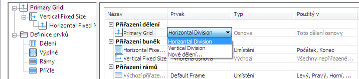 - Klikněte na sloupec Prvek u příslušné osnovy a v seznamu vyberte definici dělení.