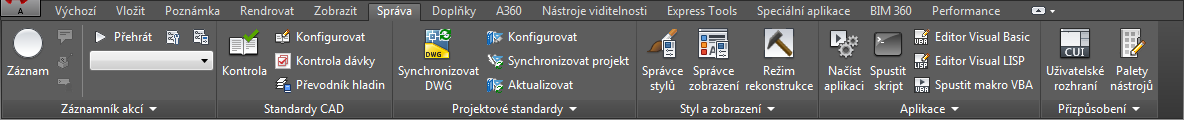 Na kartě Správa naleznete funkce pro pokročilé uživatele a správce CAD.