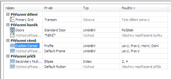 Po vytvoření definic prvků pro styl sestavy dveře/okno, můžete přiřadit tyto definice ke každému typu prvku sestavy dveře/okno: dělení, výplně buňky, rámy a příčle.