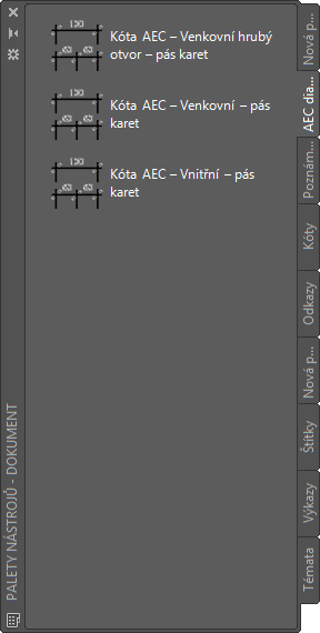 Vlastní palety vytvořené správcem CAD nebo jinými uživateli mohou také obsahovat nástroje kót AEC s kótovacími styly a vlastnostmi, které je možné přizpůsobit projektům či kancelářským standardům.