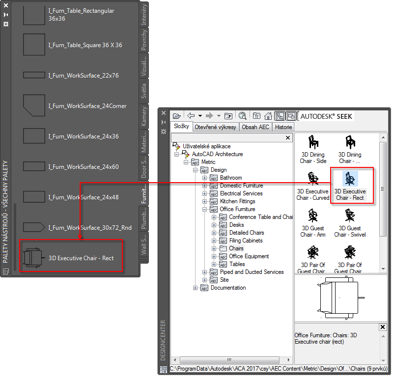Položky obsahu AEC je možné ze složky DesignCenter přetahovat do palety nástrojů.