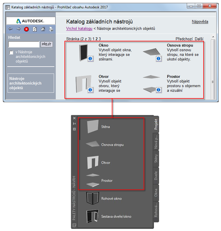 Tento postup se používá k připojení nástroje z katalogu v Prohlížeči obsahu do palety nástrojů v aplikaci AutoCAD Architecture.