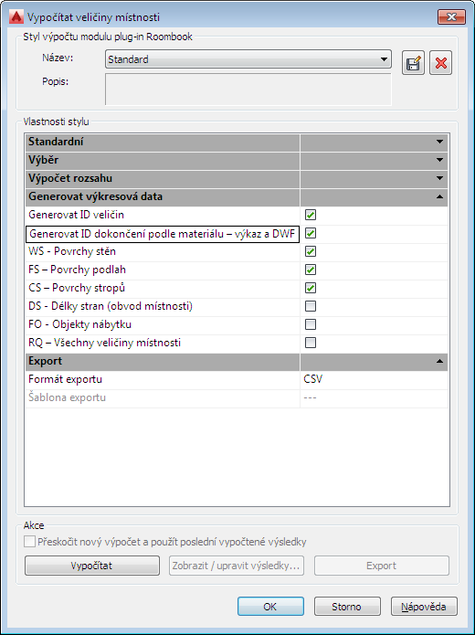 - V dialogu Vypočítat veličiny místnosti vyberte v části Vlastnosti stylu v seznamu Generovat data výkresu možnost Generovat ID konečné úpravy podle materiálu.