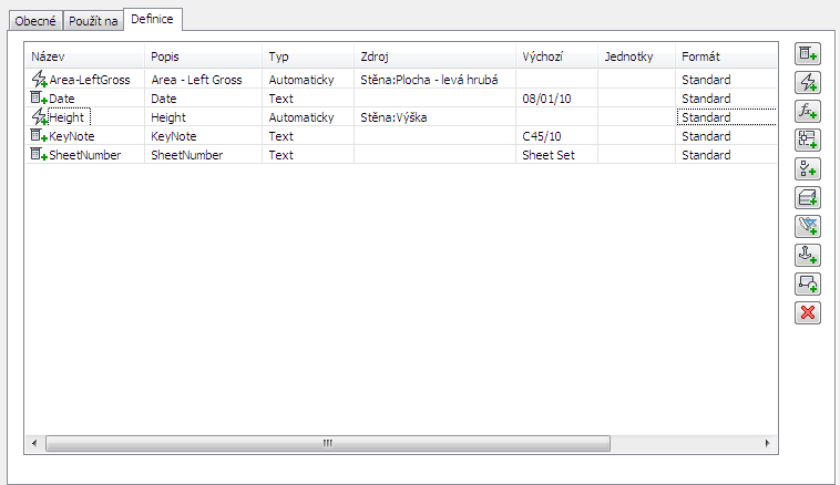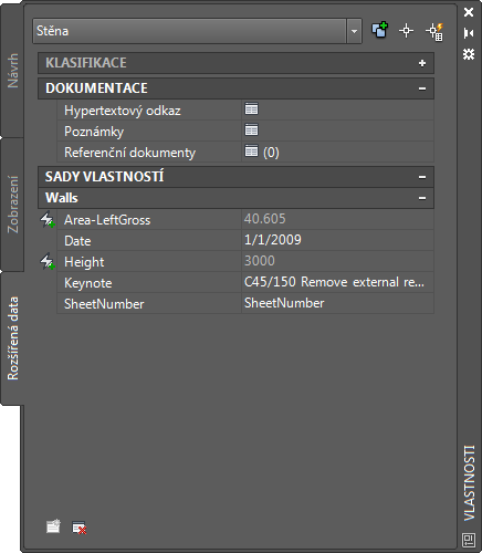 Vlastnosti stěny s poli klíčové poznámky, data a sady listů