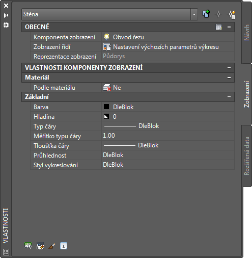 Stejně jako karta Projekt na paletě Vlastnosti umožňuje kontrolu fyzických vlastností objektu nabízí karta Zobrazení možnost kontroly grafických vlastností objektu úpravou nastavení jeho jednotlivých součástí zobrazení, jako jsou hranice a šrafování. Změny provedené na této kartě jsou ihned viditelné v aktuálně platném vyjádření zobrazení, jako je Půdorys nebo Model, a uživatel má možnost použít ve vyjádření zobrazení použít vlastní změny. Také platí, že i když se nastavení na kartě Projekt vztahuje pouze k aktuálně vybraným objektům, můžete určit, zda se změna provedená ve vlastnosti na kartě Zobrazení bude vztahovat k vybrané součásti všech objektů daného typu, všech objektů daného stylu nebo pouze vybraného objektu. Je-li komponenta zobrazení určována podle materiálu, budou se změny vztahovat ke všech objektům používajícím daný materiál.