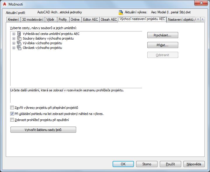 Tento postup slouží k nastavení výchozích možností projektů aplikace AutoCAD Architecture. Pro projekty lze nastavit následující možnosti: