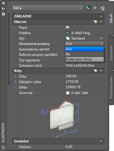 - Na paletě vlastností zobrazte nastavení vlastnosti Ohraničené prostory v některém z následujících umístění: