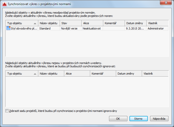 V tomto případě nebude nestandardní verze při příštích synchronizacích znovu uvedena, kromě případu, kdy zvolíte možnost Zobrazit sadu objektů, které budou při synchronizaci s projektovými normami ignorovány, nebo odstraníte příznak Ignorovat v nastavení stylu nebo zobrazení ve Správci stylů nebo Správci zobrazení, jak je popsáno v části Vyloučení stylů a nastavení zobrazení ze synchronizace.