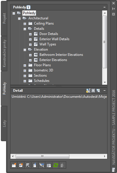 Karta Pohledy na paletě Navigátoru projektu je místem, kde se vytvářejí jednotlivé pohledy vašich stavebních dat. Pohledy obsahují konstrukční prvky a jsou hlavním místem pro přidávání poznámek, štítků a kót v projektu. Po vytvoření výkresu pohledu v něm můžete vytvářet pohledy modelového prostoru.