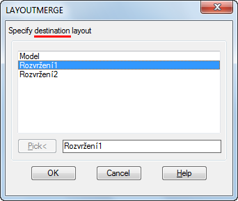 Specify destination layout or [?] <Model>: Určete název existujícího rozvržení nebo zadejte nový název, chcete-li vytvořit nové rozvržení.
