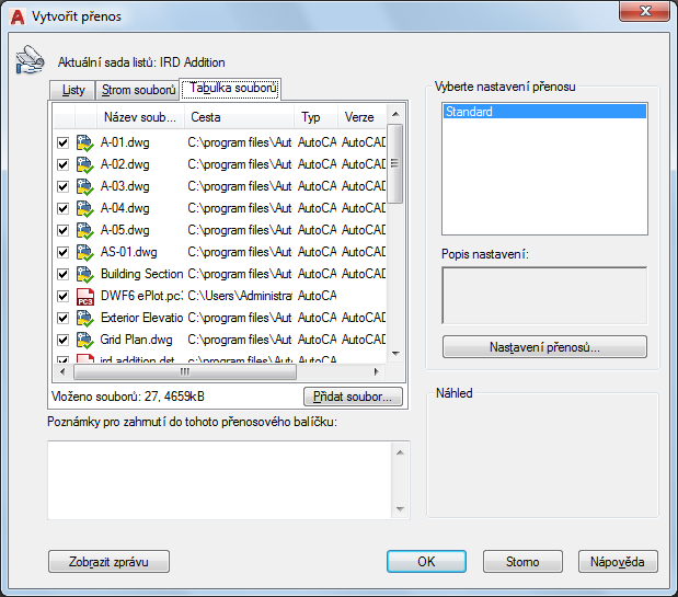 Implicitně jsou všechny soubory spojené s aktuálním výkresem (jako jsou externí reference, styly vykreslování a písma) uvedeny v seznamu. Do přenosu můžete přidat soubory nebo existující odstranit. Soubory, které jsou odkazovány prostřednictvím URL, nejsou do přenosu zahrnuty.