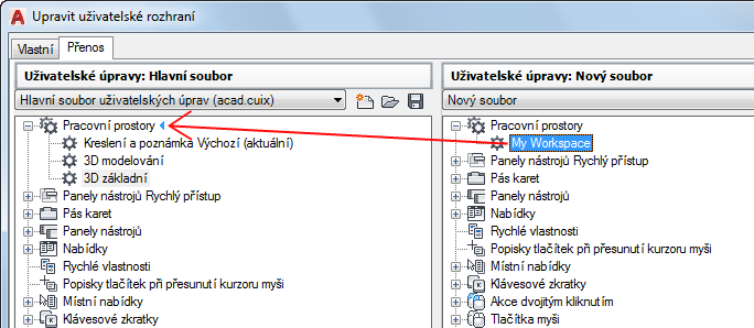 V podokně Uživatelské úpravy <název souboru> (vpravo) přetáhněte pracovní prostor ze souboru CUIx do uzlu Pracovní prostor hlavního souboru CUIx v podokně Uživatelské úpravy <název souboru> (vlevo).