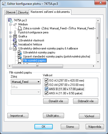 Každý plotr má maximální potisknutelnou plochu, která je daná způsobem uchycení papíru a tím, kam až se může pohybovat vozík s pery. Pokud vytvoříte rozměr papíru, který je větší než rozměr nabízený v Editoru kalibrace plotru, zkontrolujte, zda je plotr schopen tuto velikost pokreslit.