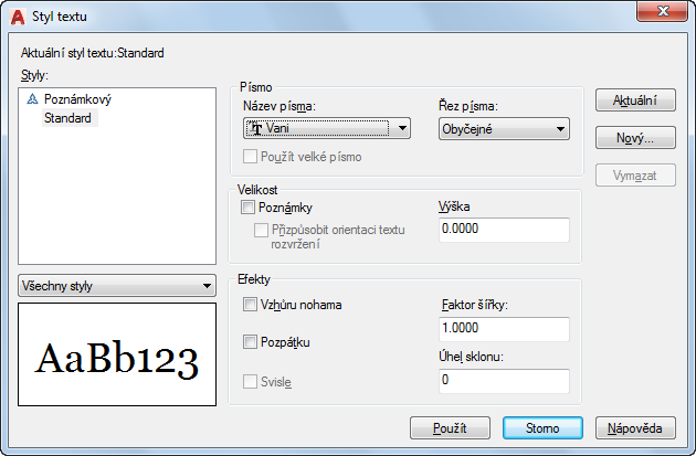 Nastaví výšku textu podle hodnoty, kterou zadáte. Zadáním výšky větší než 0.0 se automaticky nastaví výška textu pro tento styl. Zadáte-li hodnotu 0.0, bude použita výchozí výška shodná s naposledy použitou výškou textu nebo hodnota uložená v souboru šablony výkresu.