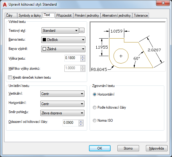 Pokud má styl textu zadaný na této kartě pevnou výšku textu, přepíše tato hodnota výšku textu zadanou zde. Pokud zde chcete nastavit výšku pro text kóty, ujistěte se, že výška stylu textu je nastavena na hodnotu 0. Informace o nastavení výšky textu u stylů textu najdete u příkazu PÍSMO.