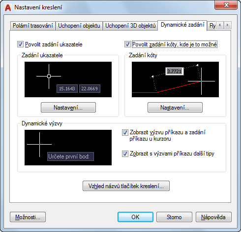 Řídí vstup ukazovátka, kóty, dynamické výzvy a zobrazení nápovědy pro kreslení.