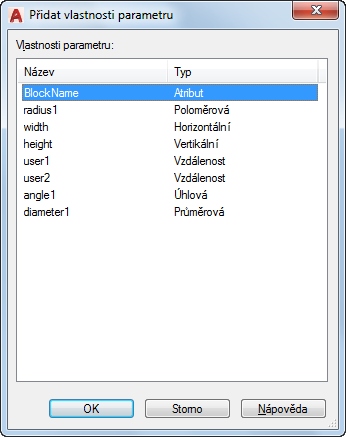 Slouží k zobrazení názvů parametrů dostupných pro přidání do tabulky vlastností bloku.