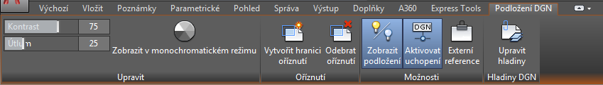 Vyberete-li ve výkresu podložení DGN, zobrazí se na pásu karet kontextová karta Podložení DGN.