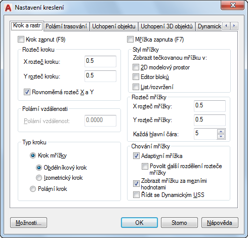 Pokud je hodnota 0, vzdálenost polárního kroku převezme hodnotu X rozteče kroku. Nastavení v poli Polární vzdálenost se používá ve spojení s polárním trasováním a nebo trasováním objektů. Pokud není trasování zapnuto, volba Polární vzdálenost nemá účinek.
