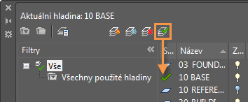Všechny nové objekty jsou při kreslení vkládány na aktuální hladinu. Zelená značka zatržení ve Správci vlastností hladiny označuje aktuální hladinu.